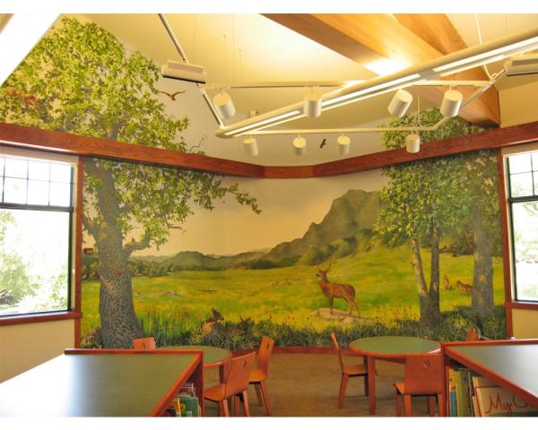 The Friends of the Agoura Hills Library commissioned Denise Jones to paint this mural when the new Library was built in 2001. The mural depicts a sunlit grassy meadow in which deer and other California wildlife appear. Reminiscent of the Hudson River School landscapes and illustrations from early twentieth century children’s books, the image curves along the wall of the library’s children’s section.