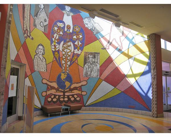 José Antonio Aguirre’s monumental mural Our Legacy: Forever Presente... was commissioned by former First District County Supervisor Molina for the East Los Angeles Library. Aguirre’s vibrant four-part mural covers more than 2,000 square feet of wall space with Byzantine and Venetian glass mosaic with carved limestone inside and outside the west and east towers of the library’s main entrance. The mural is articulated in four movements: “The Gift to Humanity," “Arrival," “The Heart of the People" and “Departure.” Throughout each cycle, iconic images representing significant East Los Angeles public leaders, social and political figures, actors, artists and athletes are depicted. The figures include Edward James Olmos, Congressman Esteban Torres, Congressman Edward Roybal, Cesar Chavez, Dolores Huerta, Ruben Salazar, David Alvaro Siqueiros, Self-Help Graphics Founder Sister Karen Boccalero, Anthony Quinn, Antonia Hernandez, Supervisor Gloria Molina and Oscar De La Hoya. In the words of the artist, “I have created a visual image filled with symbolic elements of duality, history and social consciousness to provoke, question, offer definition and provide recognition of the rich, bi-cultural identity that binds the East Los Angeles community.”