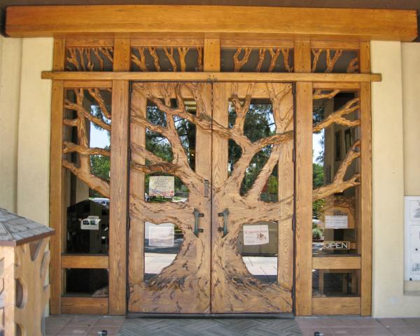 In 1985 Ruben Guajardo began working on the doors for the La Verne Library which ended up taking three years and more than 950 hours of labor. Funded by the artist, SOLVE (Save Old La Verne Environment Committee) and Friends of the La Verne Library, the doors are intracately carved from oak. The wood for this project came from a 500-year old landmark oak tree at La Verne Heights School removed by city authorities when it become a safety hazard. Guajardo salvaged the tree; which was significant to him because he grew up in the La Verne area and climbed the oak tree as a child. Guajardo designed the doors as an homage to his parents, Jess and Sara Guajardo, and as a gift to the citizens of La Verne. In 2012, 27 years later, Guajardo presented the library with a carved wooded light fixture to compliment the door.