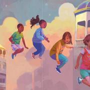 The cover of artist Andrew Hem’s community coloring zine depicts the digital painting, On the Same Team – the mural he created for the exterior wall of the Child Care Center. In this painting, Hem conveys the community's desire for a bond of trust when individuals can rely on each other for collective efforts. He states that the metaphor of the jump rope conveys this message most effectively as group jump rope is a game without rivalry or competitiveness, where children work together to create a rhythm together.