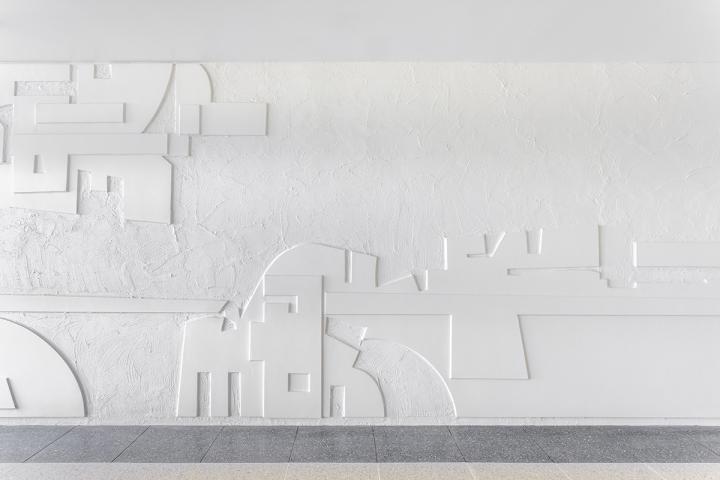 Dora De Larios created this plaster veneer bas-relief mural for the Rowland Heights Library when it was being constructed in 1978. The artwork fills an entire wall in the library’s foyer with an abstract composition of geometric shapes that rise from the floor and descend from the ceiling. Dora De Larios cut all of the mural’s plaster forms and then attached them to the wall. A master plasterer, hired by De Larios, finished the texture of the surface shapes with a steel trowel and used a brush broom for the mural’s background. The artwork represents a rare departure from ceramics in Dora De Larios’ body of work. There is only one other similar artwork she has made, commissioned by the City of Hawaiian Gardens for the city council chambers around the same time.