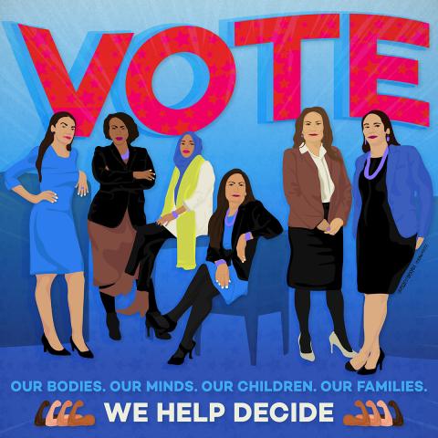 Driven by a pop-art aesthetic and bold colors, the underlying theme in Ragni Agarwal’s work is the beauty of diversity and inclusion. Her piece is derived from Martin Schoeller’s portrait for Vanity Fair of six freshman congresswomen from the class of 2018, the most diverse in history, showing how a woman’s right to vote directly impacts her life. Alexandria Ocasio-Cortez, Ayanna Pressley, Ilhan Omar, Deb Haaland, Veronica Escobar, and Sharice Davids are exercising their civic duty by serving in office, a direct outcome of the 19th Amendment. By doing so, they continue to raise the glass ceiling for all women.